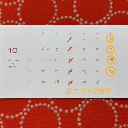 土曜日は夜カフェがございます。夜のまったりしたひと時にぜひお立ち寄りくださいませ。